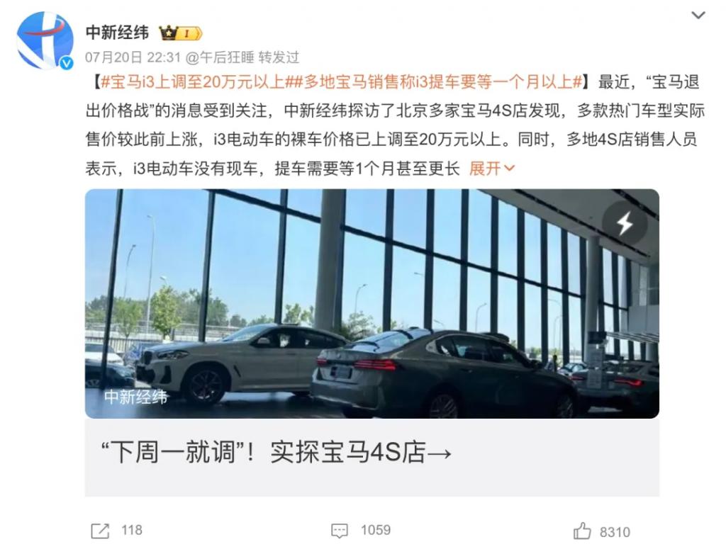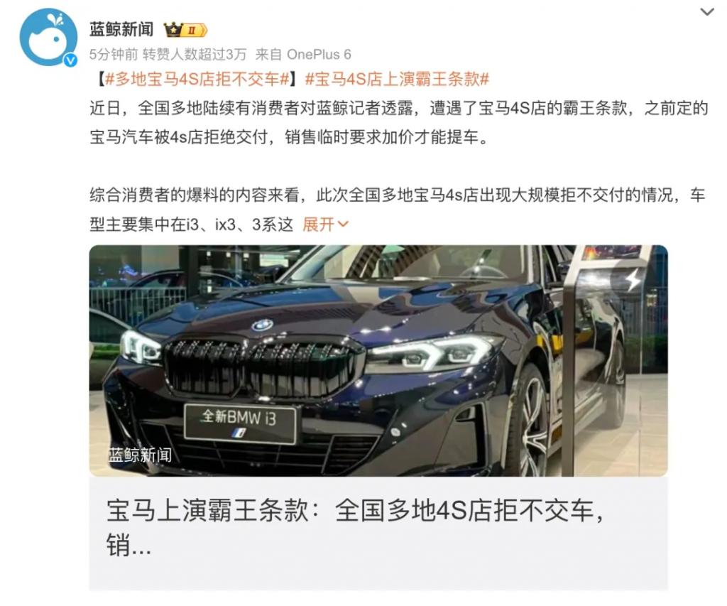 根据媒体的报道,许多消费者在购买宝马汽车时遭遇了 4S 店的霸王条款。多地宝马 4S 店拒绝交付新车,并要求消费者加价后才能提车。综合消费者爆料的信息,此次全国多地宝马 4S 店出现了大规模的拒不交付情况,涉及的车型主要包括 i3、ix3 和 3 系。大多数消费者在 5 月底到 6 月初订购了车辆,然而在 7 月提车时,却被要求临时加价 3 万元。此外,即使部分消费者最终提到了车辆,这个过程也充满了艰辛,即使手续齐全,也需要在多次催促后才能完成提车。