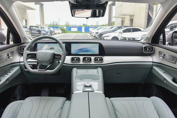 座舱部分,该车延续瑞虎 9 的双联屏中控布局,三幅式方向盘也是家族式设计,背面有电子怀挡机构,空调出风口有点奔驰的味道,另外,全景天窗、HUD 抬头显示、256 色氛围灯、手机无线充电、索尼音响系统(14 个扬声器)也都有应用。