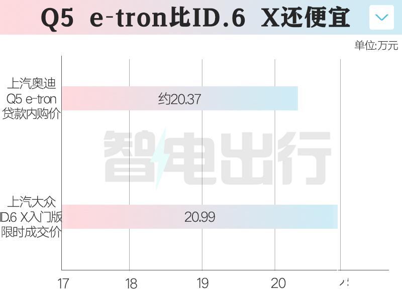 Q5 e-tron 全款内购价便宜约 7.36-8.79 万元,贷款内购价便宜约 9.48-11.42 万。指导价 29.85 万元的 Q5 e-tron 闪耀型,贷款裸车价约 20.37 万元,比 ID.6 X 入门版限时成交价还便宜。
