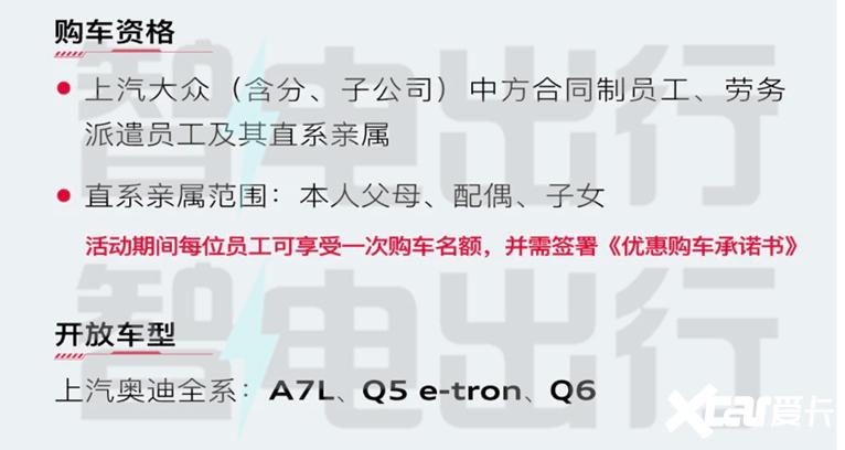 员工内购价部分车型可能存在长库龄车辆,且不可叠加常规零售客户优惠和权益、Q5 e-tron 不提供免费充电桩、不包含上海市政府相关的补贴金额等。