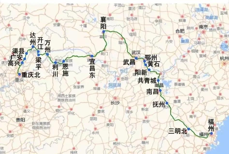 列车全程停靠车站有:重庆北、高兴、广安、渠县、达州、开江、梁平、万州、利川、恩施、宜昌东、襄阳、武昌、鄂州、黄石、阳新、共青城、南昌、抚州、三明北、福州
