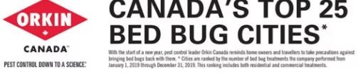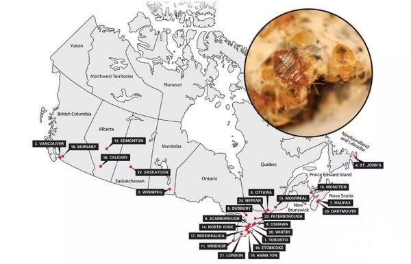 最近,除虫害公司“Orkin”根据他们过去一年处理过的床虫虫害数据,统计出了加拿大最受床虫侵扰的25个城市。