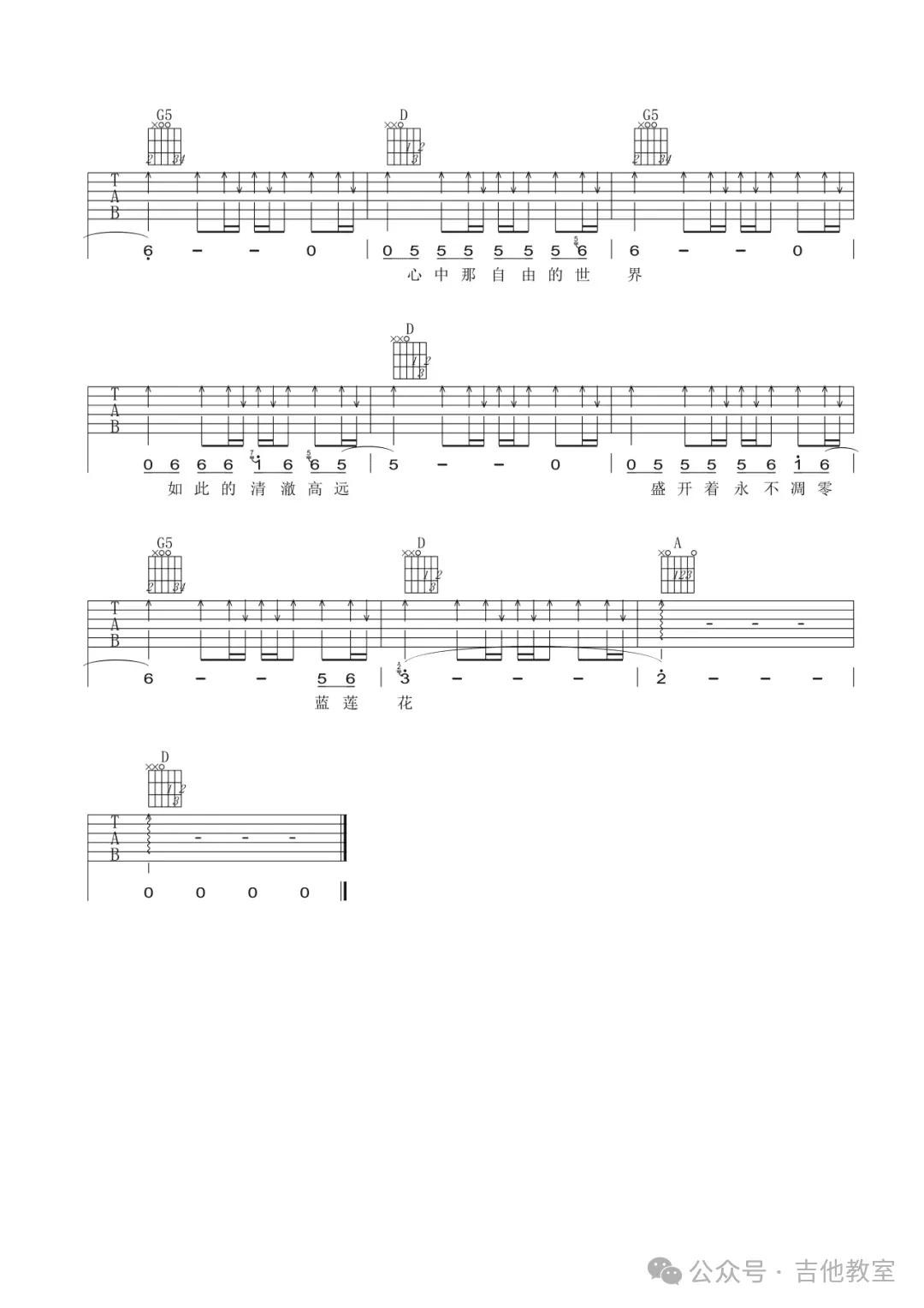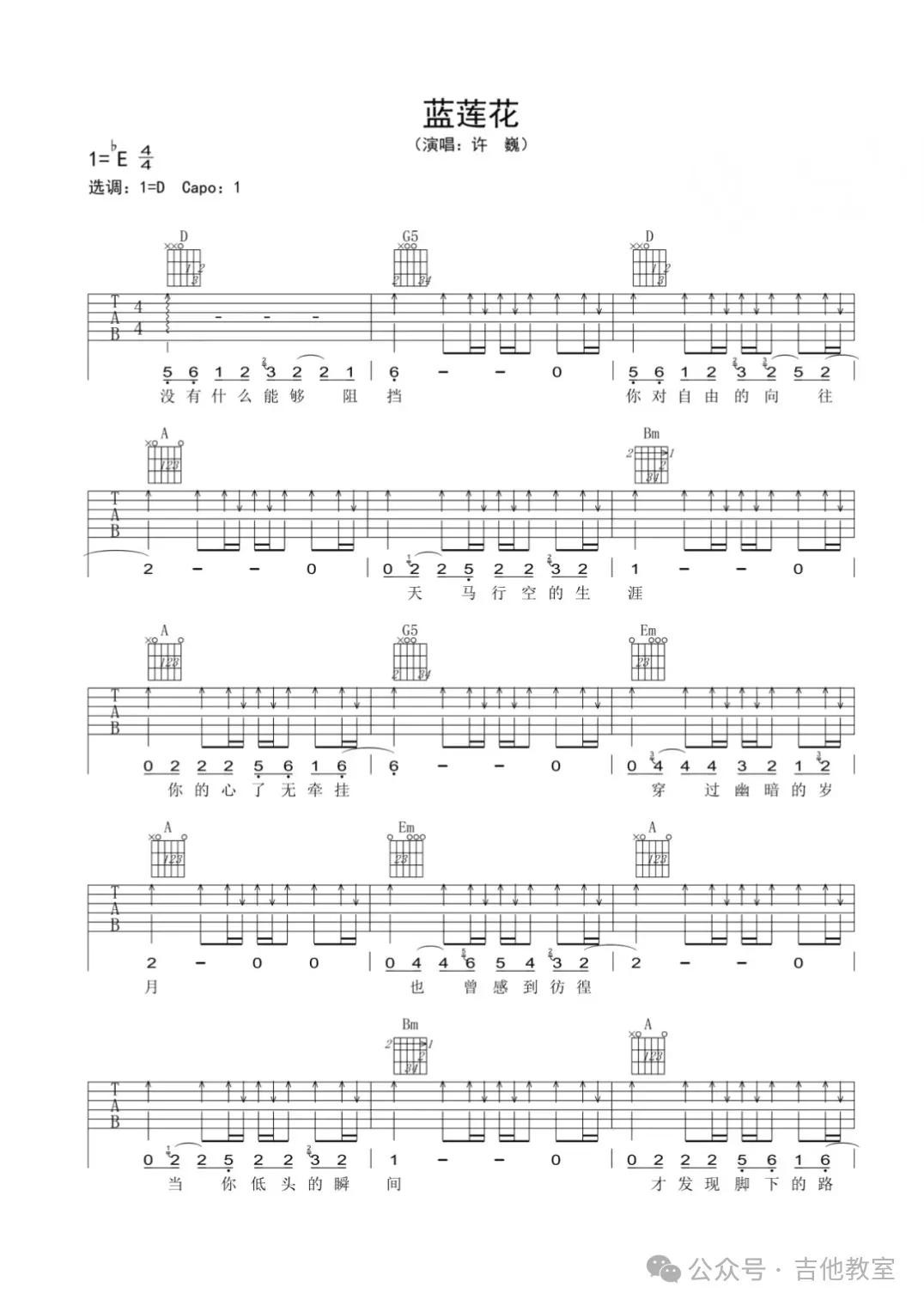 许巍的《蓝莲花》以其自由的灵魂和激昂的旋律深受吉他爱好者的喜爱。这首歌曲的和弦编配简洁有力,适合初学者练习和弦转换的流畅度和力度控制。