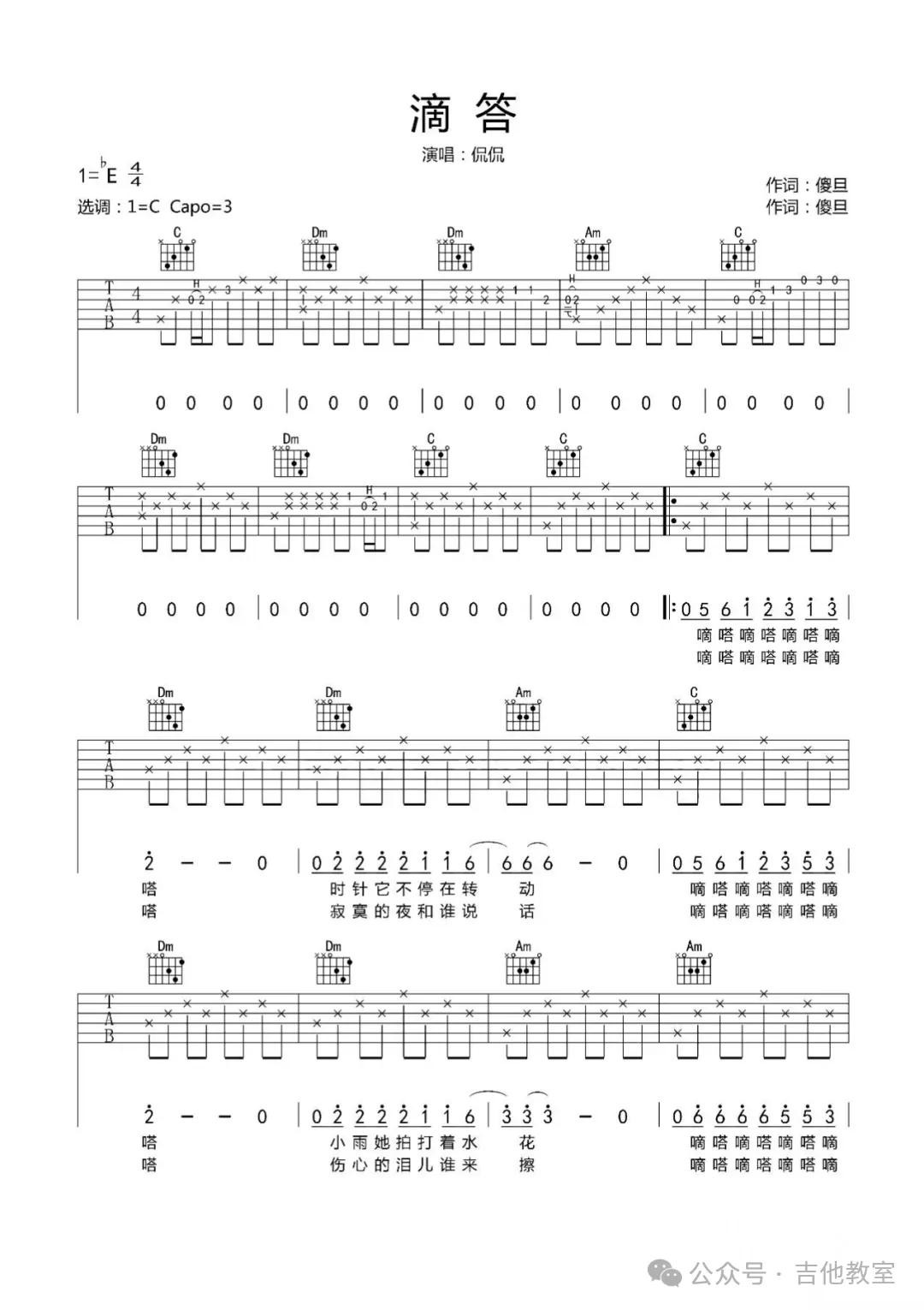 作为一首温柔细腻的民谣,侃侃的《滴答》以其简单明了的和弦进程和深情的旋律深受喜爱。这首歌曲的和弦转换平缓,非常适合初学者练习手指灵活性和节奏感。