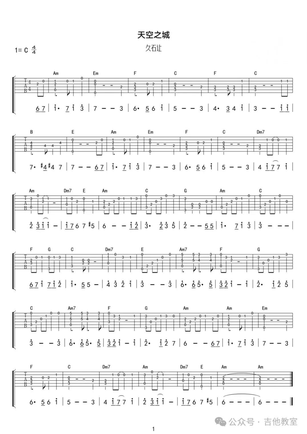 久石让为宫崎骏动画电影《天空之城》创作的主题曲,旋律优美而悠扬,是吉他指弹爱好者的必学曲目之一。虽然有一定难度,但分解和弦版本对初学者来说相对友好,能够很好地锻炼手指的独立性和控制力。