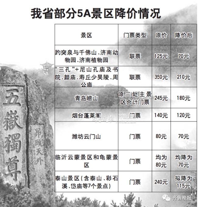 根据今年9月份省物价局发布的消息,山东全省共出台景区降价方案162个,平均降幅为25%,降幅超过50%的20个。其中10处5A级景区,9家推出降价措施。其中,青岛崂山由245元降为180元,烟台蓬莱阁由140元降为120元,潍坊的云门山由80元降为70元,临沂的云蒙景区和龟蒙景区各由80元降为70元。