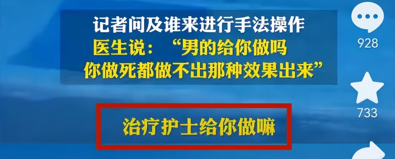 对于由谁来进行操作的问题,医生直言不讳地表示是女护士来做,并强调男护士给你做死也做不出效果。这一言论不禁让人深思:一个正规医院为何会推出如此具有争议性的服务?为什么男护士做不出一点效果?