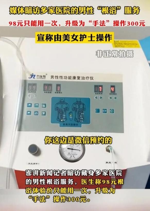 为了揭开这一事件的真相,记者决定亲自前往医院一探究竟。他乔装打扮成一名想要尝试根浴服务的“男病人”,踏入了医院的大门。在与医生的交流中,记者得知该服务不仅使用仪器治疗,还有手法治疗。