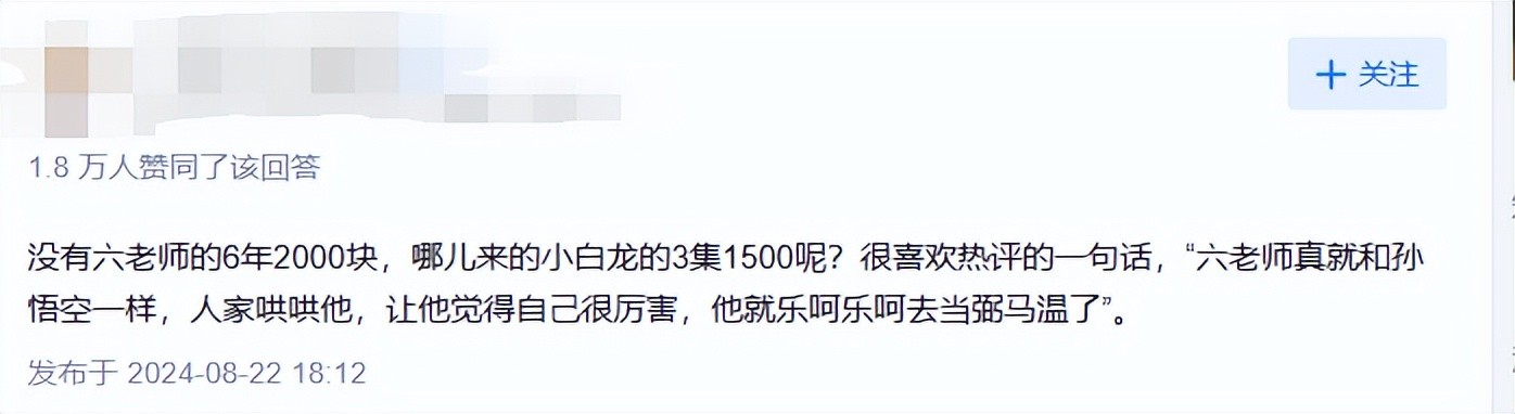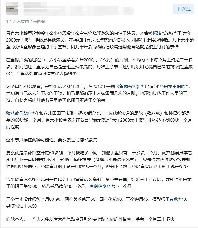 比如饰演小白龙的王伯昭,他仅仅拍摄了 3 集,就拿到了 1500 块的片酬 。如此悬殊的差距,让人瞠目结舌。网友对此有个评论:“六老师真就和孙悟空一样,人家哄哄他,让他觉得自己很厉害,他就乐呵乐呵去当弼马温了”。