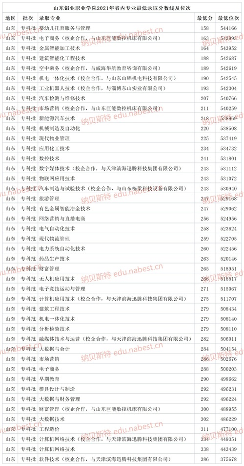 山东铝业职业学院2021年高考省内专业最低录取分数线