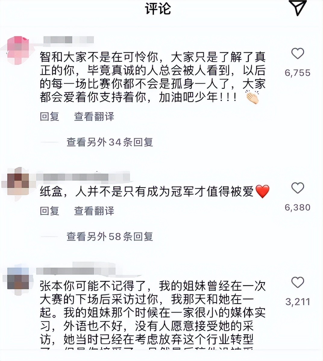 “怜爱张本了,准备成为张本的球迷,不像有的选手,输了理由还那么多!。”