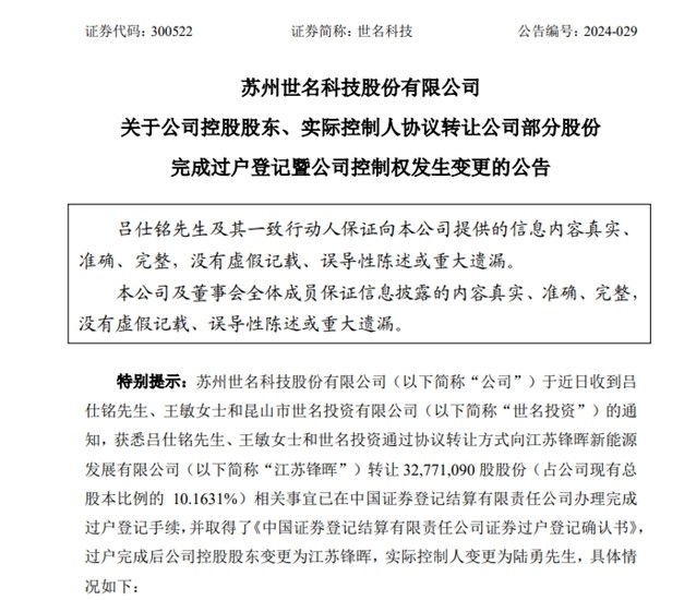 2024年开始,吕仕铭就开始出售自己的股份,接手世名科技的是江苏锋晖聘请西南证券股份有限公司,实控人是陆勇。