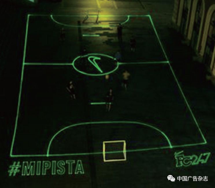Nike在西班牙马德里曾开展了一场名为“Football anytime, anywhere”的Campaign,其用夜光投影为年轻人创造出运动场地, 不只改变了运动中的某些元素, 更是创造出新的运动场景。