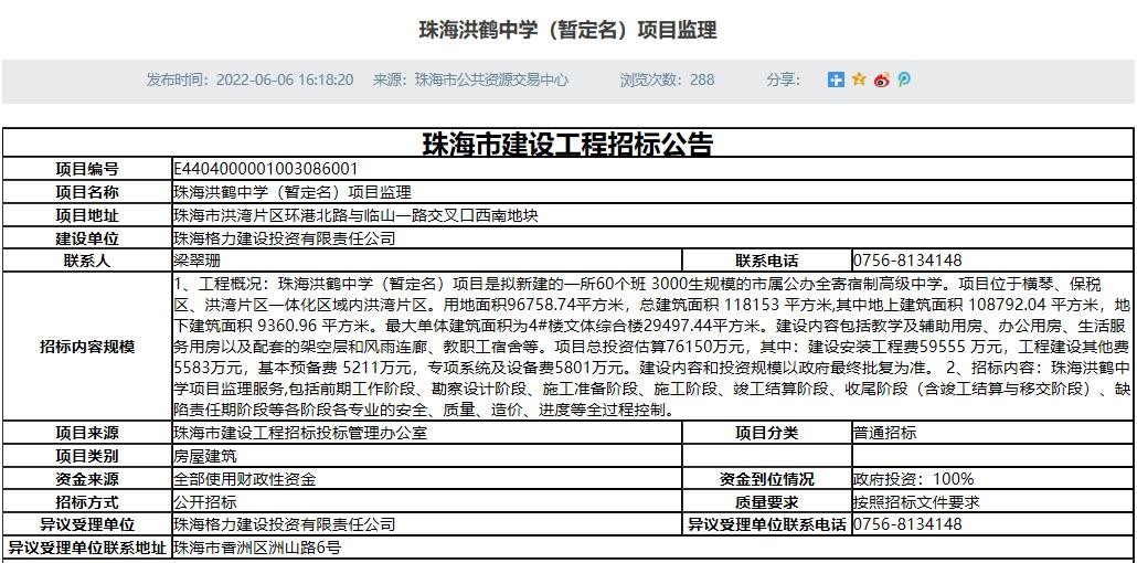 就在昨日,珠海市公共资源交易中心发布了珠海洪鹤中学(暂定名)项目造价咨询服务和珠海洪鹤中学(暂定名)项目监理公告。