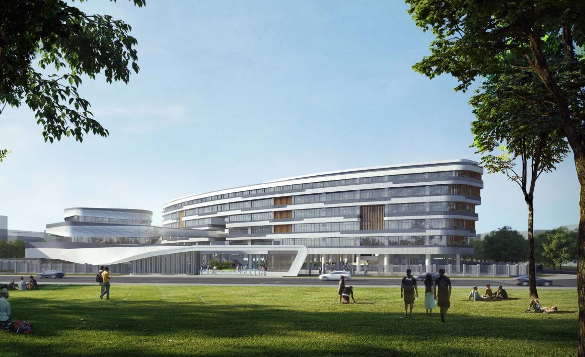 从鸟瞰视图看到,整体建筑线条流畅。3栋主要综合教学楼以S型结构串联,并点缀有空中园林。