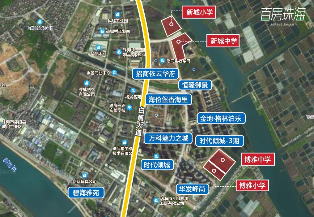 据规划来看,新城中学的选址位于斗门区白蕉镇虹桥五路南侧,禾益中路东侧,占地面积40917㎡。周边有招商依云华府、恒隆御景花园等住宅小区,与新开学的博雅中学也相距不远。