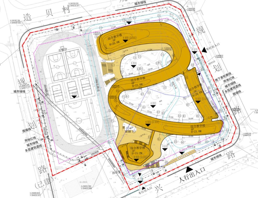 根据公示内容,造贝中学位于造贝路东侧、造兴路北侧。总占地面积3.2万㎡,总建筑规模约4.2万㎡,容积率0.94。