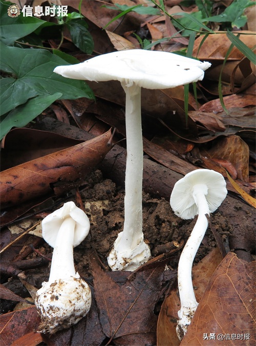 这几株致命白毒伞有的被落叶盖了大半,但因通体颜色雪白,只要一冒头还是十分显眼,其叶柄有长有短。“通体很脆,很容易断,”李泰辉说,该毒菇有菌托和菌环,是其两个主要识别特征之一,菌环在菌盖的下面,为白色薄膜,有时在菌盖开时会被撕破消失,形象来说,“穿了靴子、有一圈围脖的蘑菇,千万别吃。”