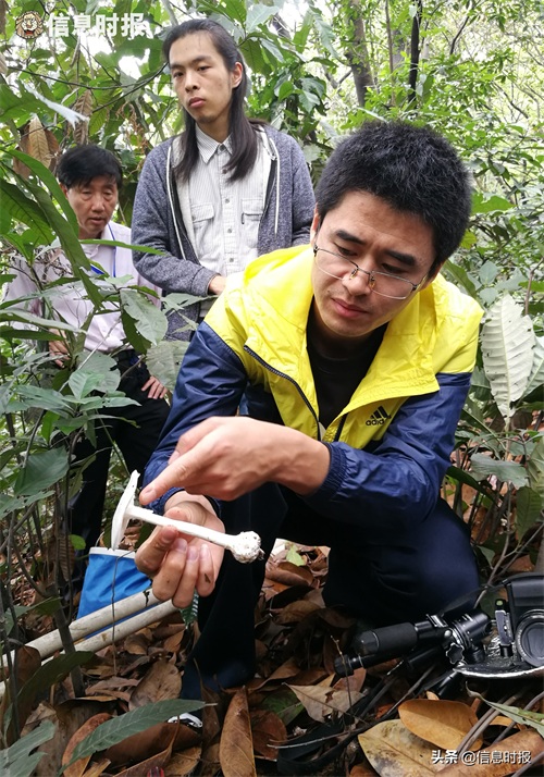 广东省微生物研究所李泰辉博士及其团队研究人员,在白云山发现了致命白毒伞。图为研究人员拍照后将白毒伞带