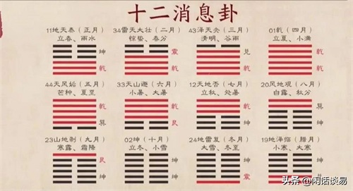 复卦也是十二消息卦之一,代表的时间是十一月。卦辞中“反复其道,七日来复,利有攸往。”,说的就是消息卦的变化。从姤卦的一阴初生到复卦的一阳复生,中间刚好经历了七个卦。如图。