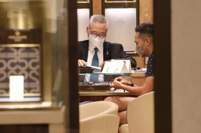 夫妻俩来到一家钟表店,一入店内就跟负责人打招呼,关系相当熟络,看来他们是该店的熟客。