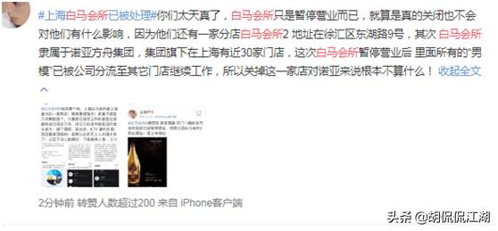 该微博在网上迅速引发热议,当地静安分局警方回应称:旺旺大厦的白马会已被公安机关依法处理,会所已经停止营业。