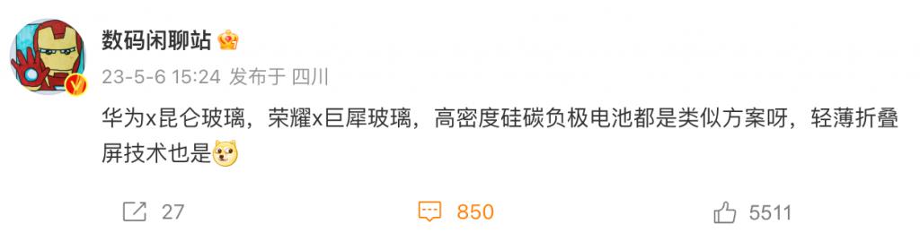 爆料达人暗示华为昆仑玻璃、荣耀巨犀玻璃,华为硅碳负极大电池、荣耀青海湖电池(硅碳负极电池技术),轻薄折叠屏技术也是。即华为、荣耀虽然是独立的两个厂商,但这几个都是类似的方案。