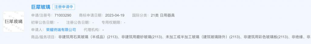 如上图所见,近日荣耀申请了名为 " 巨犀玻璃 " 相关的多个商标。