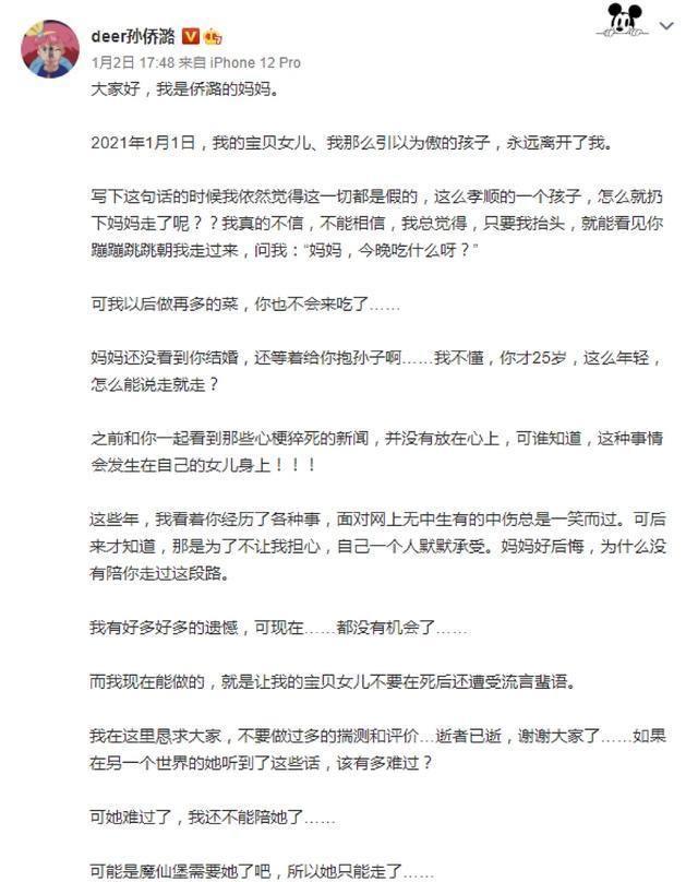 2025年刚到来,孙侨潞还没有好好看一下2025就永远离开了大家。2025年1月1日,年仅25岁的孙侨潞因心梗去世,宣布这个消息的是她的妈妈,1月2号孙妈妈用孙侨潞的微博公布了孙侨潞因为心梗离世的消息,回应了1月1号网上流传孙侨潞因为喝酒猝死的传言,看到孙妈妈写的这些文字,真的好心疼她。