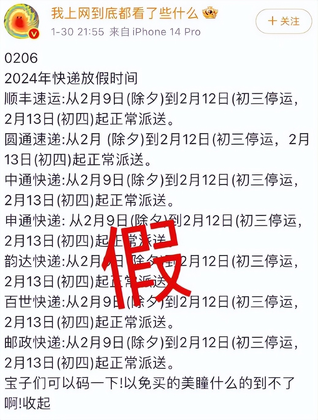 2月1日,有账号发文晒出快递公司2024年春节期间放假时间,其中包括顺丰、圆通、中通、申通、韵达、百世、邮政等多家快递公司。随后#快递停运时间#和#多家快递公司辟谣网传春节停运时间#等话题冲上热搜,引发大量关注和热议。