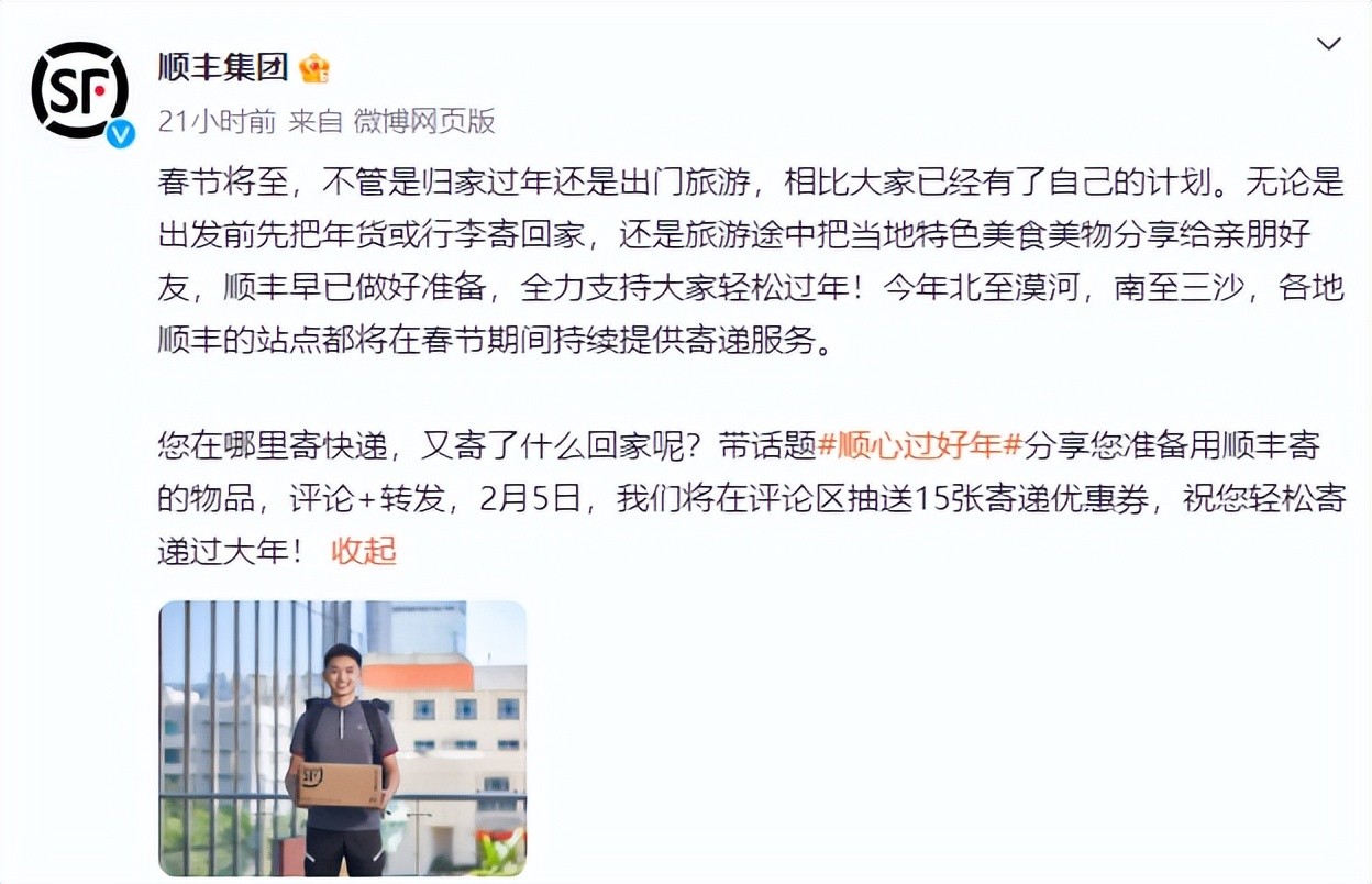 对此,1月31日,顺丰集团官方微博发文称,“今年北至漠河,南至三沙,各地顺丰的站点都将在春节期间持续提供寄递服务。”