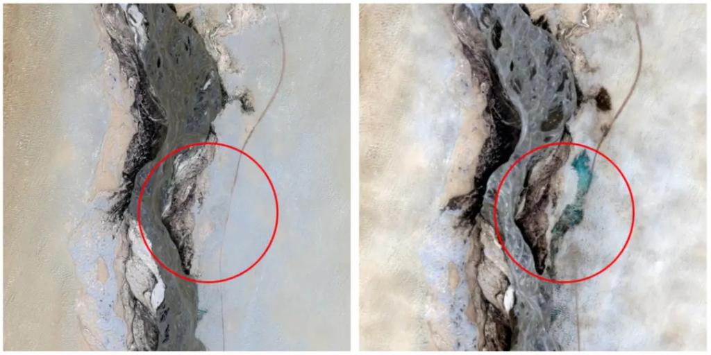 塔里木河,流经塔克拉玛沙漠北部边缘。下面的图片,展示的分别是 8 月 18 日(左)和 8 月 24 日(右)的塔里木河局部。