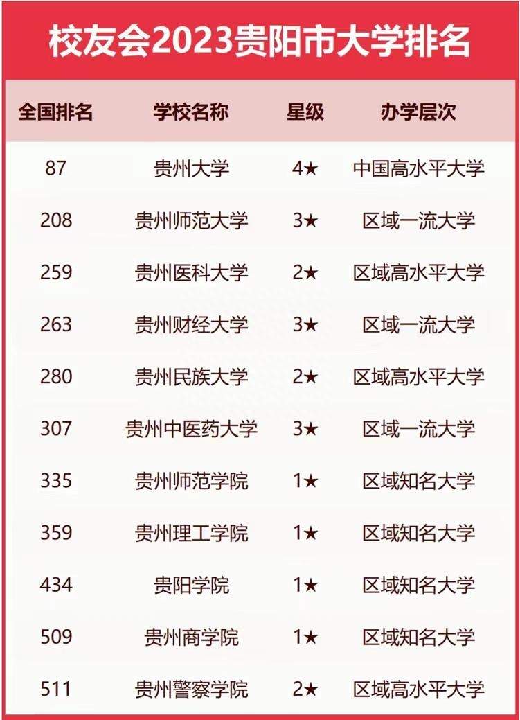 上榜的11所本科院校,在全国高校的排名从第511名至第87名不等,其中,贵州大学、贵州师范大学、贵州医科大学居榜单前3名,是贵阳市综合实力最好的大学,分别居全国高校第87名、第208名、第259名。