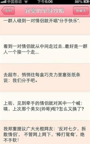 14.七夕情人节单身男女攻略:①打电话把酒店大床房预订光;②上街扇别人男友耳光然后痛哭;③去影院把单号座买光;④抱个孩子去认爹;⑤上街卖花,见情侣就说:给你妈买束花吧!⑥吃饭不结账,走时指着别人男友说:我前夫买;⑦去qq好友印象,男的写:前任老公。女的写:孩子他妈。