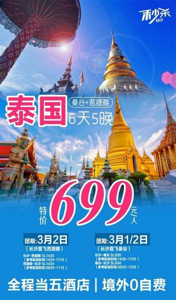 二、机票加团费便宜,以长沙为例,市场上有很多航班,几乎每天都有两趟航班,还有很多旅行社做包机飞泰国,市场供大于求,几乎每天都有特价处理机位,非常划算!反正机位空着也是空着,不如低价上座,能收回一点算一点!如图~