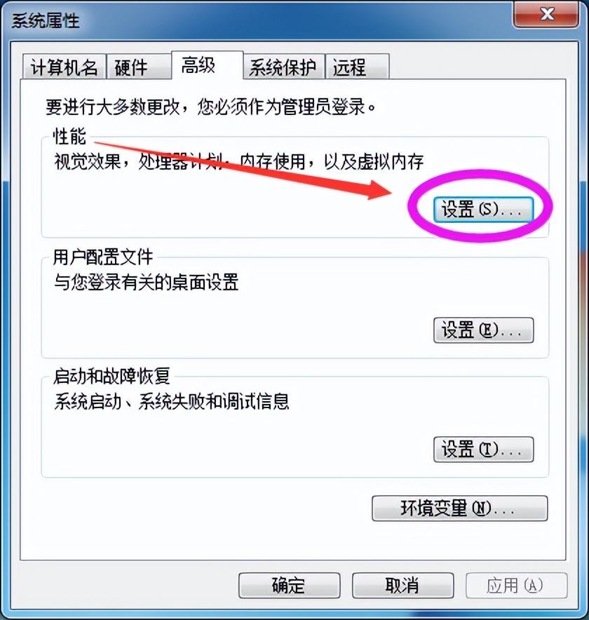 (3)点击【性能设置】接着在系统属性窗口里面,点击高级选项下面性能后面的“设置”选项;