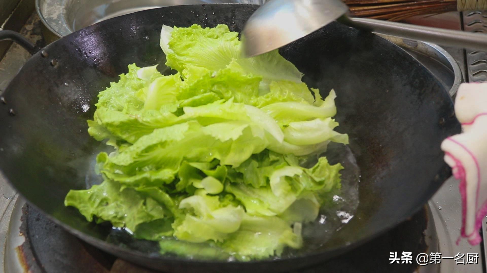 等水烧开后,下入生菜叶,用勺子翻动几下,使生菜受热均匀。