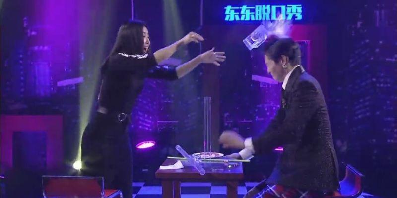 玩得忘乎所以的王蓉,兴奋拿起水杯,向男主持泼去,这一泼不要紧,重点是王蓉手中的水杯和水一起飞向了男主持!