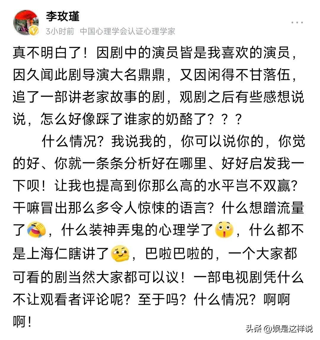 估计李玫瑾也没想到自己的观剧感想,居然引起了如此轩然大波,强大如心理专家,也承受不住了。