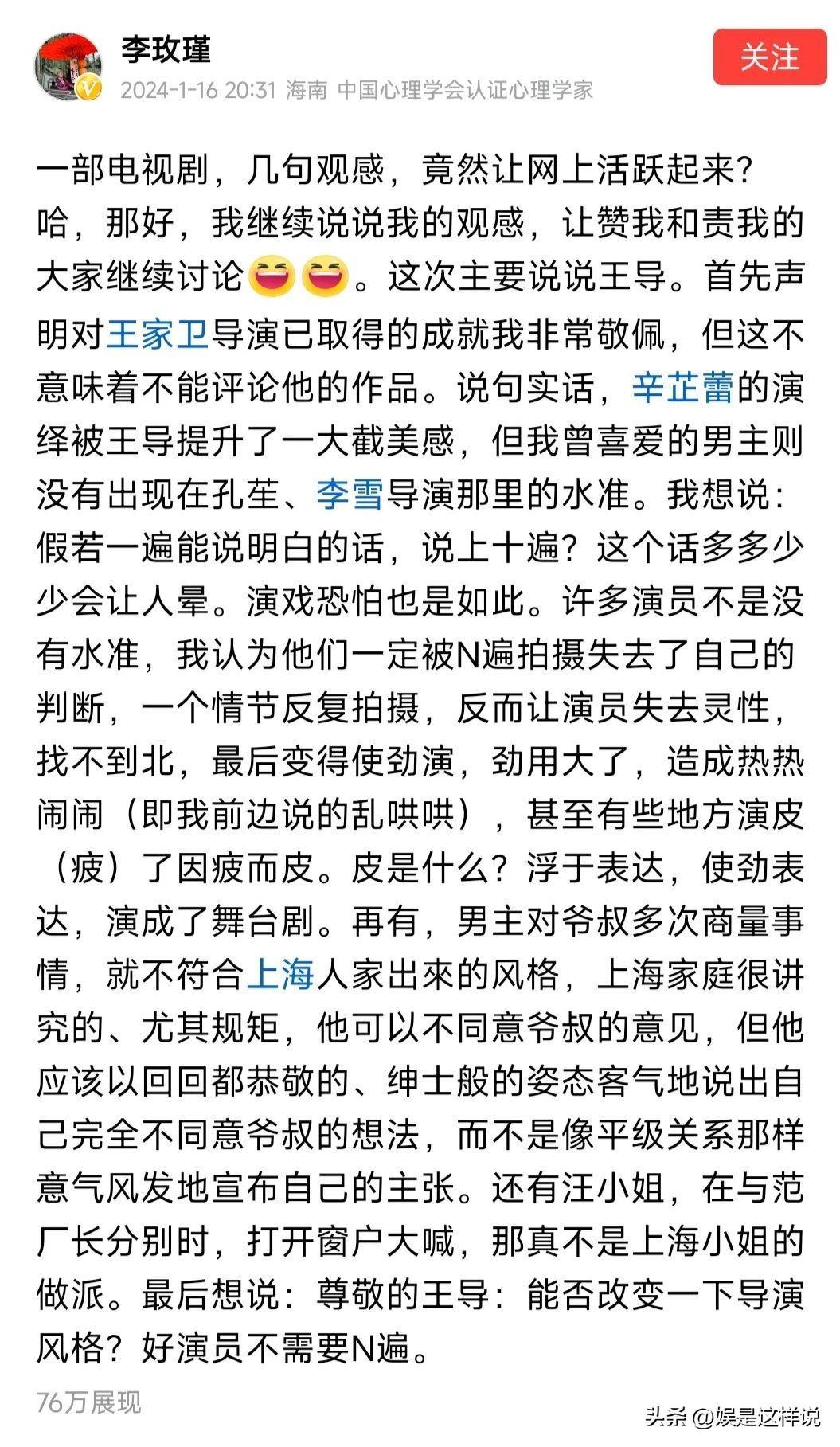 著名心理学家李玫瑾教授,作为上海人,也加入了“追剧大军”,追完剧随手在社交平台发表了自己观看《繁花》的感想,没想到却引发了争议。