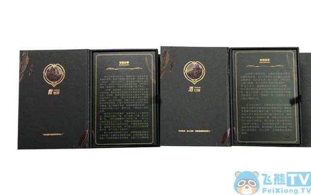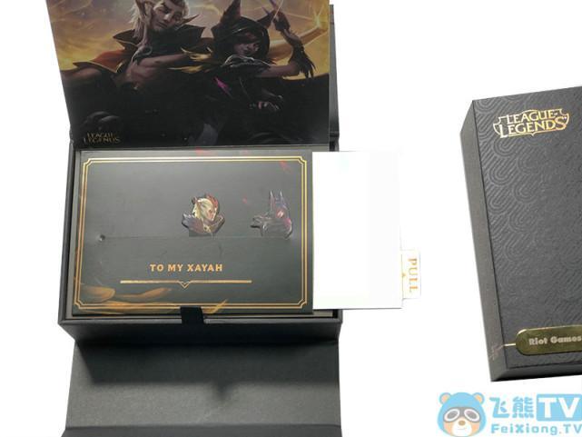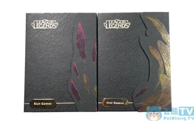 将单独两个产品从外包装中抽出及为上图这个样子两款内包装还是有很多相似之处,不同之处只有两个英雄的特征,紫色羽毛代表的是逆羽-霞,而黄色羽毛则代表幻翎--洛。包装表面还有“英雄联盟”英文的金色logo字样,左下角为“拳头游戏”英文铭牌,不过小编这个是测试版本,玩家在周边商城购买的时候可以在金属铭牌上定制姓名哦!。