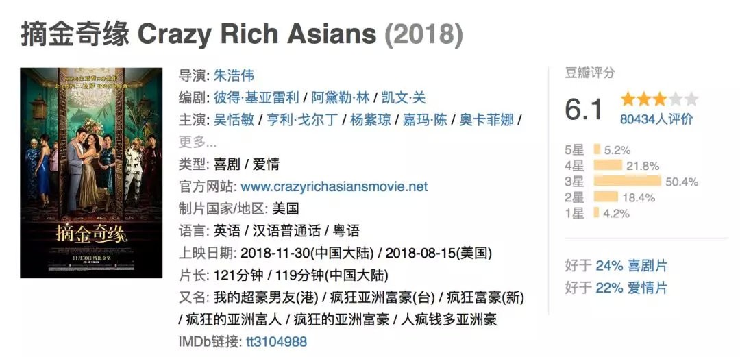 最典型的,首部由全亚裔演员班底拍摄的好莱坞电影《摘金奇缘》,在美国口碑和票房双丰收,在中国上映后却只收获了惨淡票房和6.1的豆瓣评分。