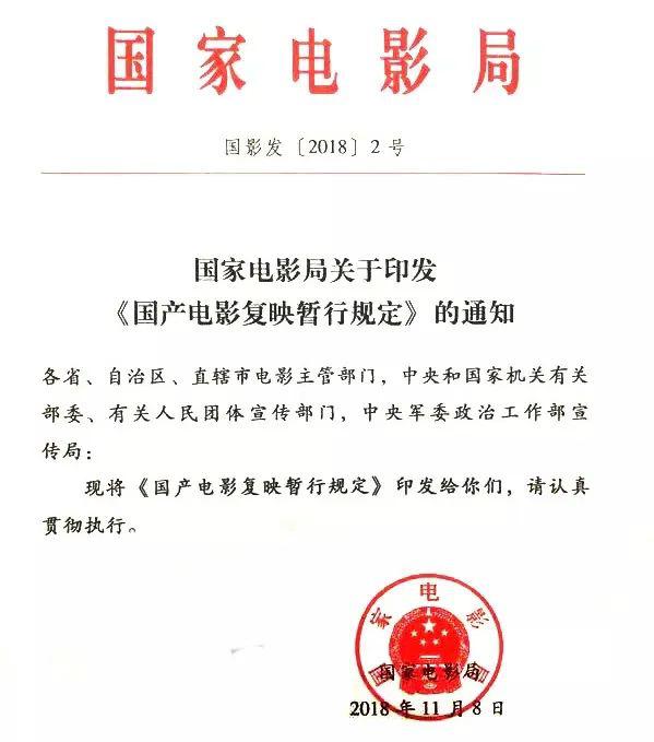 早在 2018 年底,国家电影局出台《国产电影复映暂行规定》目的就在于给 " 重映潮 " 降温,规范和完善电影复映管理,鼓励创作更多优质的原创电影。
