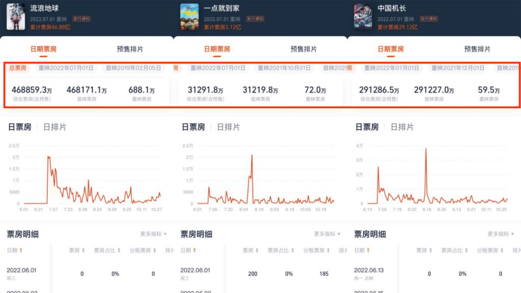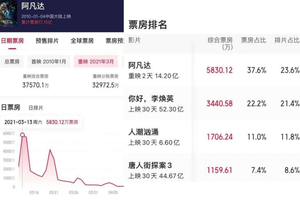 排片也不再受限,如 2021 年重映的《阿凡达》,重映第二天就以 23.6% 的排片占比超过同期霸占榜首的《你好,李焕英》成功登顶,最后拿下 3.75 亿票房成绩,甚至高出许多同期上映的新电影。
