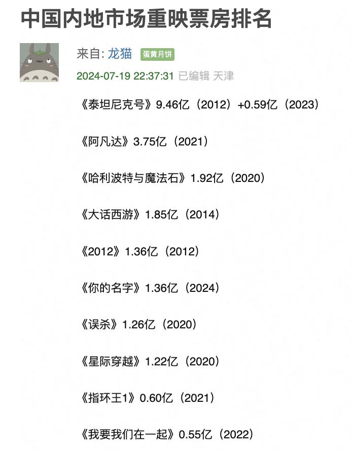 从商业价值来看,国内重映票房榜前十名,是《泰坦尼克号》《阿凡达》《哈利波特与魔法石》《大话西游》《2012》《你的名字》《误杀》《星际穿越》《指环王 1》《我要我们在一起》,不外乎是有着全球影响力、视效突出的外国进口大片,或具有粉丝基础的日本动画电影、香港经典老片。