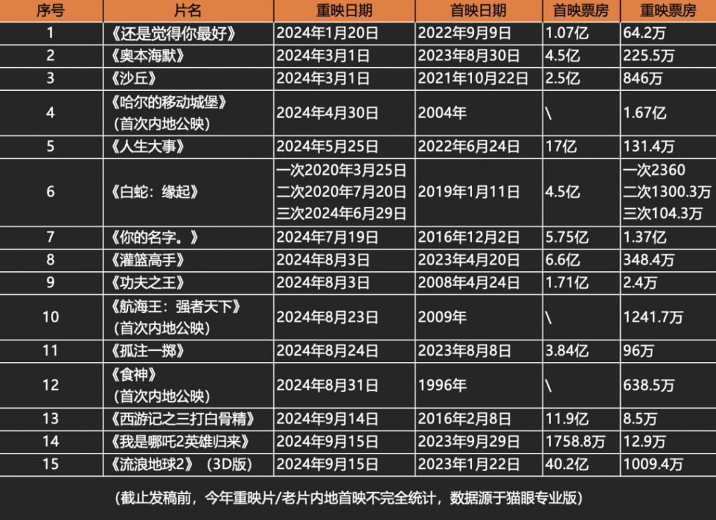 实际上,最近几年的重映片的确比以往更多,但重映的标准越来越令人琢磨不透。有的影片去年才上映,今年就重映。比如《奥本海默》《灌篮高手》《孤注一掷》,但从票房表现来看,这重映片平均票房才不到 300 万,《孤注一掷》更是只有 96 万。