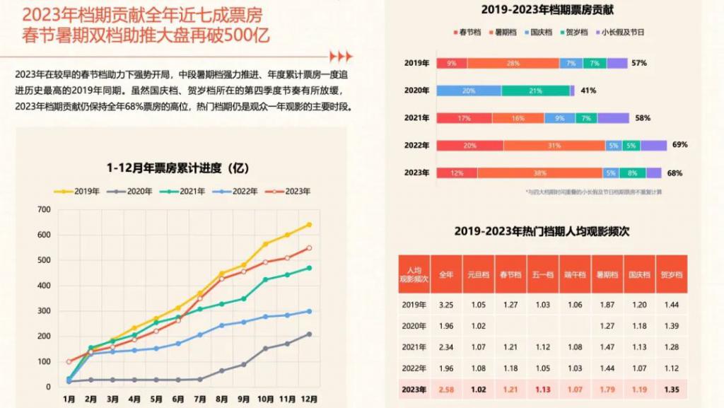从上映时间来看,由于中国电影市场票房有很大的档期依赖症,据灯塔数据,2023 年档期贡献仍保持全年 68% 票房的高位,热门档期是观众一年观影的主要时段。重映片可以尝试从平常周末档入局,不抢占热门档期,避免与新片撞档期。