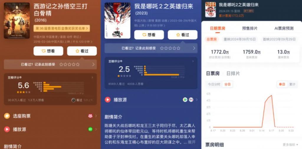 另外两部则让人有些丈二和尚摸不着头脑。一部是 2016 年春节档上映的《西游记之三打白骨精》,豆瓣评分 5.6。不少其它媒体将这一重映动作评价为 " 蹭《黑神话:悟空》热度 "。