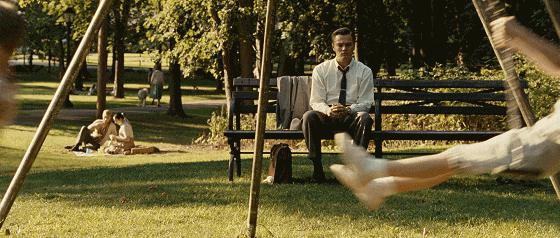 在公园里玩耍的两个孩子,就在弗兰克面前荡着秋千。