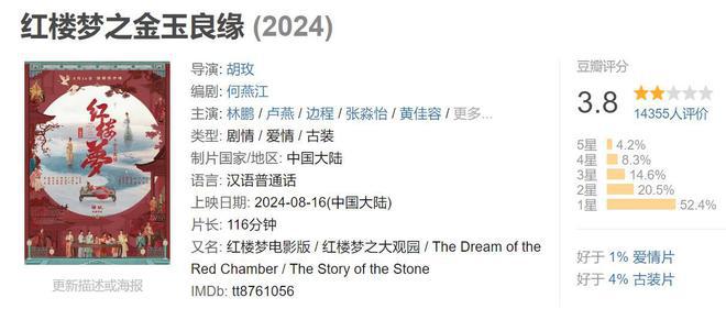 但是到了如今的电影《红楼梦之金玉良缘》中,只有 116 分钟,却想要呈现原著的全部,这不就是相当于三分钟说电影吗?但这毕竟不是短视频,而是一部长电影。尽管导演某种程度上还是反感短视频的,但最终却走向了短视频化,这何尝不是一种悲哀?!